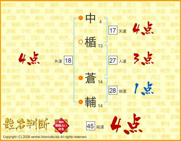 生活面を象徴する運勢です。外部から受ける影響力を表し、結婚運、家庭運や職場、環境への順応性を表します。総運から人運を引いた画数。姓や名が1文字の場合を除く。