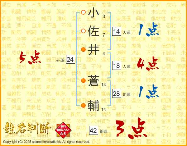 小(3画)佐(7画)井(4画) 蒼(14画)輔(14画)