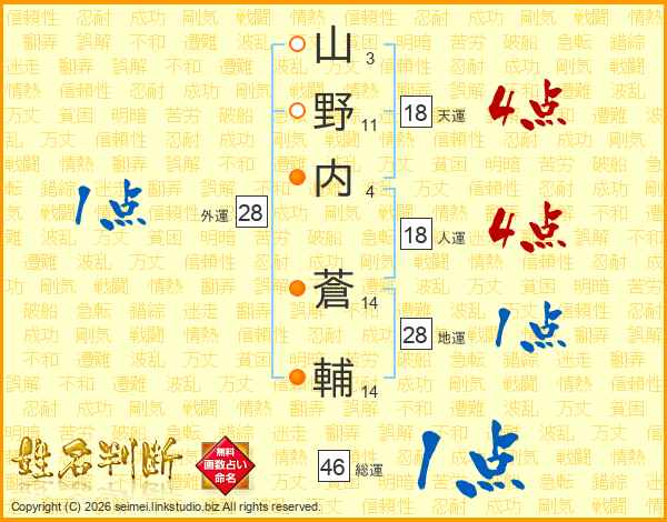 山(3画)野(11画)内(4画) 蒼(14画)輔(14画)