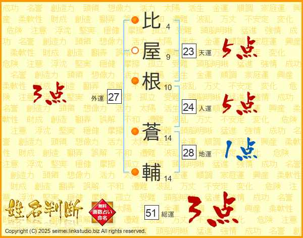 比(4画)屋(9画)根(10画) 蒼(14画)輔(14画)