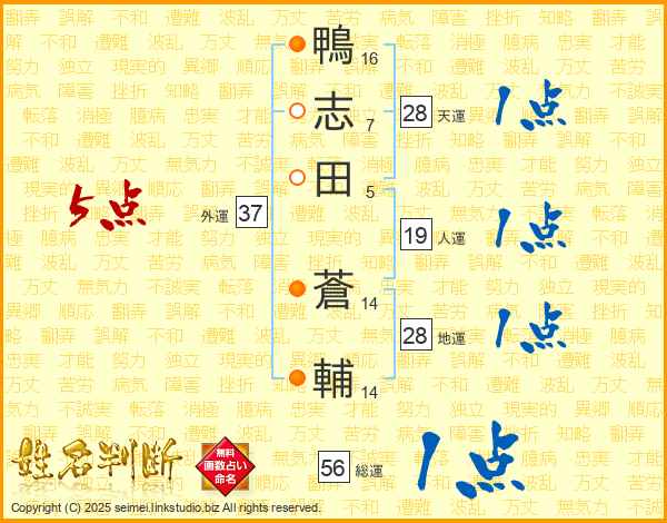 鴨(16画)志(7画)田(5画) 蒼(14画)輔(14画)