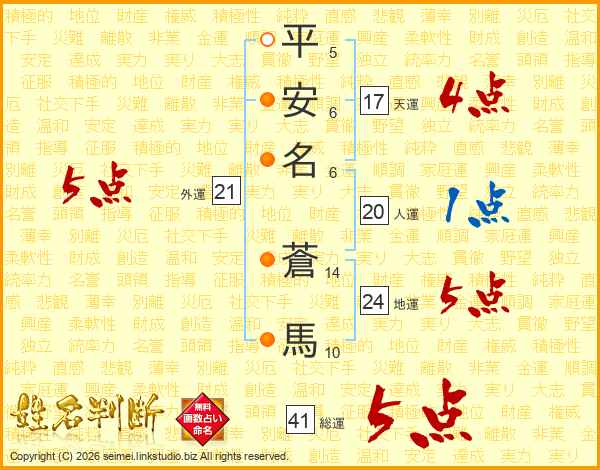 平(5画)安(6画)名(6画) 蒼(14画)馬(10画)