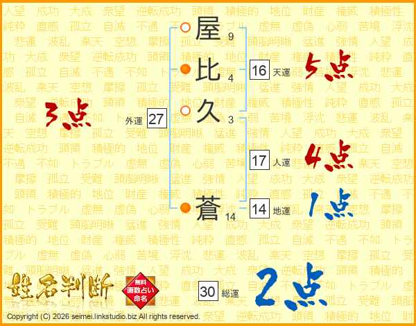 屋(9画)比(4画)久(3画) 蒼(14画)