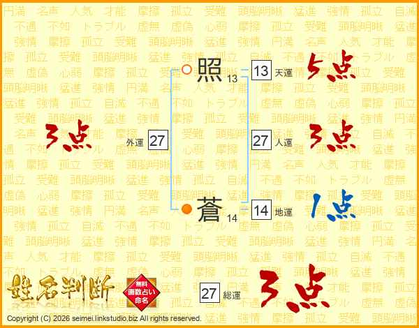 生活面を象徴する運勢です。外部から受ける影響力を表し、結婚運、家庭運や職場、環境への順応性を表します。総運から人運を引いた画数。姓や名が1文字の場合を除く。