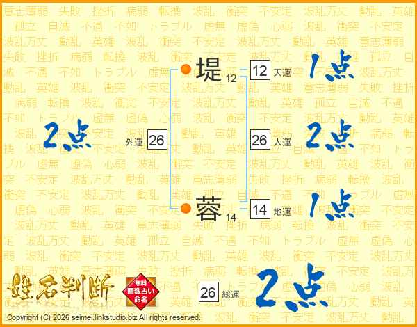 生活面を象徴する運勢です。外部から受ける影響力を表し、結婚運、家庭運や職場、環境への順応性を表します。総運から人運を引いた画数。姓や名が1文字の場合を除く。