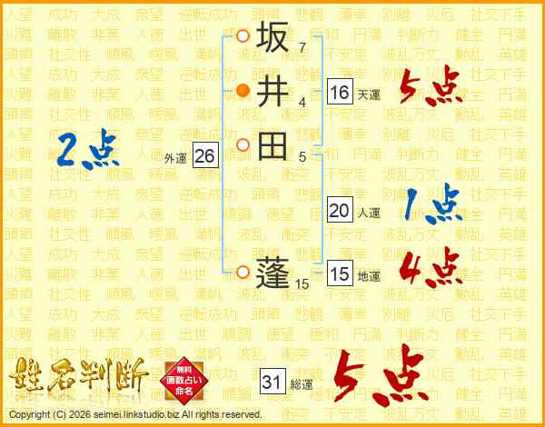 坂(7画)井(4画)田(5画) 蓬(15画)