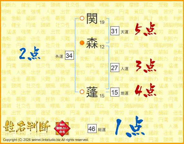 生活面を象徴する運勢です。外部から受ける影響力を表し、結婚運、家庭運や職場、環境への順応性を表します。総運から人運を引いた画数。姓や名が1文字の場合を除く。