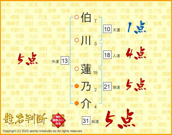 伯(7画)川(3画) 蓮(15画)乃(2画)介(4画)