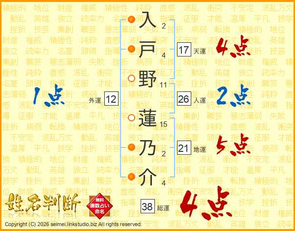 入(2画)戸(4画)野(11画) 蓮(15画)乃(2画)介(4画)