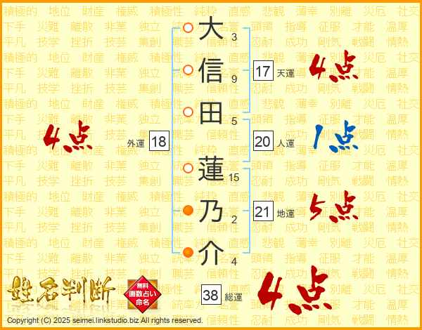 大(3画)信(9画)田(5画) 蓮(15画)乃(2画)介(4画)