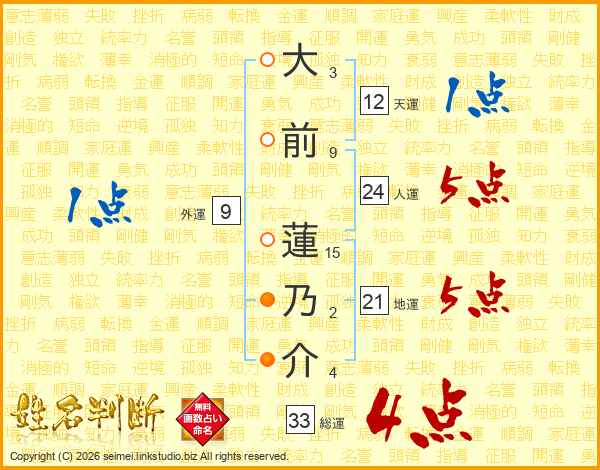 大(3画)前(9画) 蓮(15画)乃(2画)介(4画)