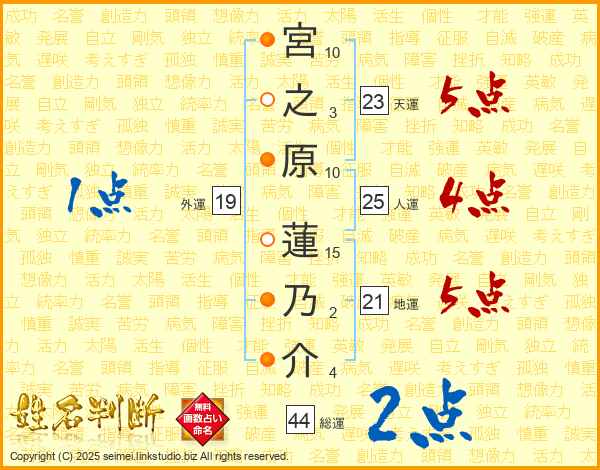 宮(10画)之(3画)原(10画) 蓮(15画)乃(2画)介(4画)