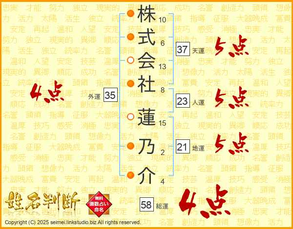 株(10画)式(6画)会(13画)社(8画) 蓮(15画)乃(2画)介(4画)