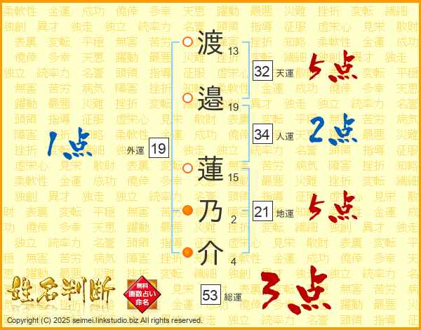 渡(13画)邉(19画) 蓮(15画)乃(2画)介(4画)