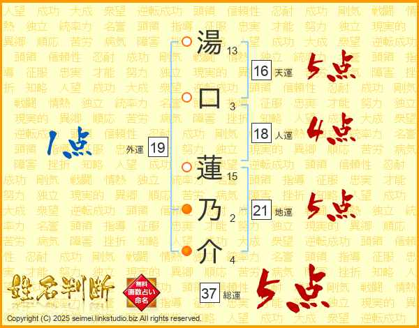 湯(13画)口(3画) 蓮(15画)乃(2画)介(4画)