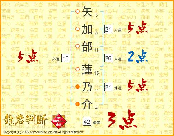 矢(5画)加(5画)部(11画) 蓮(15画)乃(2画)介(4画)