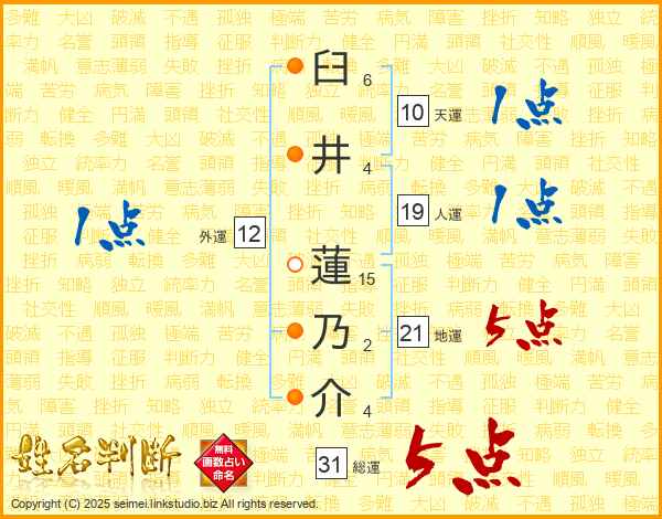 生活面を象徴する運勢です。外部から受ける影響力を表し、結婚運、家庭運や職場、環境への順応性を表します。総運から人運を引いた画数。姓や名が1文字の場合を除く。