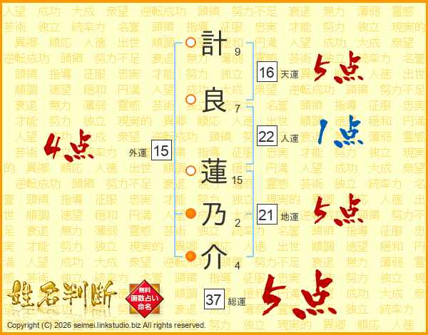 計(9画)良(7画) 蓮(15画)乃(2画)介(4画)