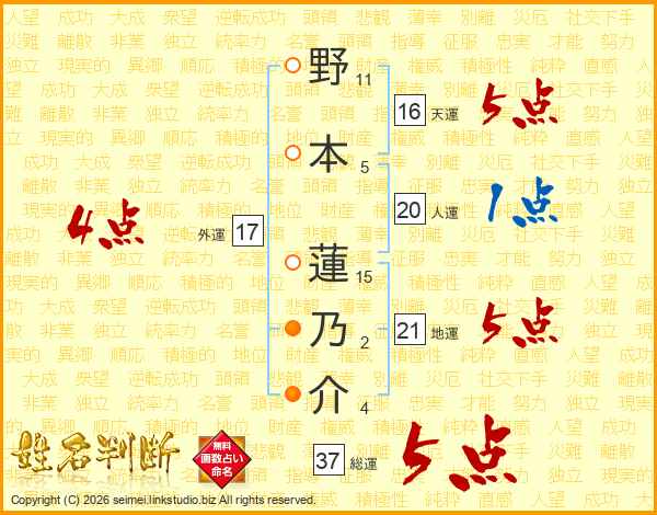 野本蓮乃介さんの総運は37画の5点!