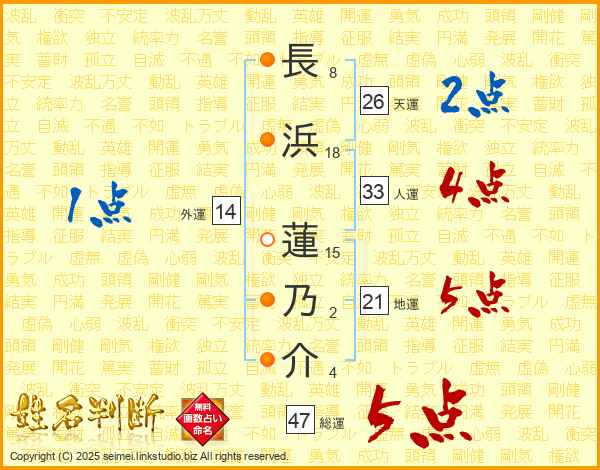 長(8画)浜(18画) 蓮(15画)乃(2画)介(4画)