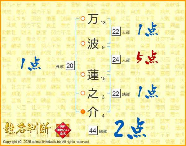 万(13画)波(9画) 蓮(15画)之(3画)介(4画)