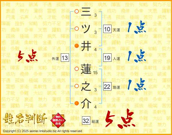 三(3画)ツ(3画)井(4画) 蓮(15画)之(3画)介(4画)