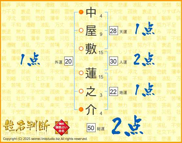 中(4画)屋(9画)敷(15画) 蓮(15画)之(3画)介(4画)