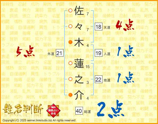 佐(7画)々(7画)木(4画) 蓮(15画)之(3画)介(4画)