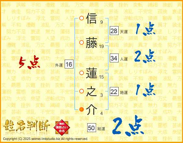 信(9画)藤(19画) 蓮(15画)之(3画)介(4画)