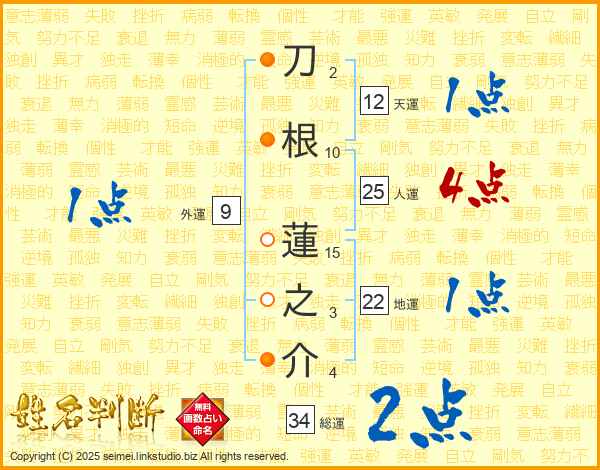 刀(2画)根(10画) 蓮(15画)之(3画)介(4画)