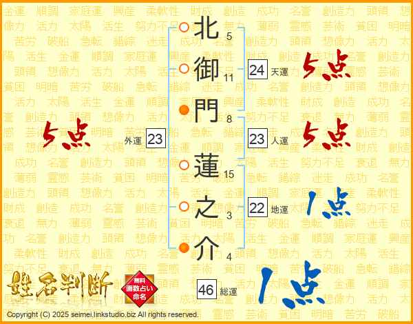 北(5画)御(11画)門(8画) 蓮(15画)之(3画)介(4画)