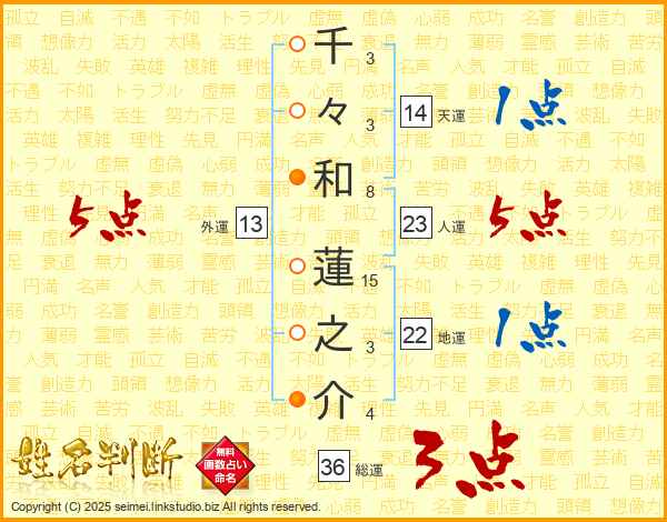 千(3画)々(3画)和(8画) 蓮(15画)之(3画)介(4画)
