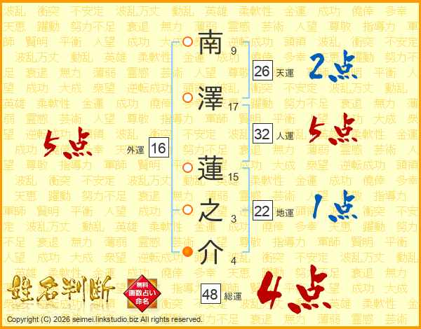 南(9画)澤(17画) 蓮(15画)之(3画)介(4画)