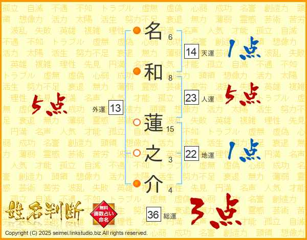 生活面を象徴する運勢です。外部から受ける影響力を表し、結婚運、家庭運や職場、環境への順応性を表します。総運から人運を引いた画数。姓や名が1文字の場合を除く。
