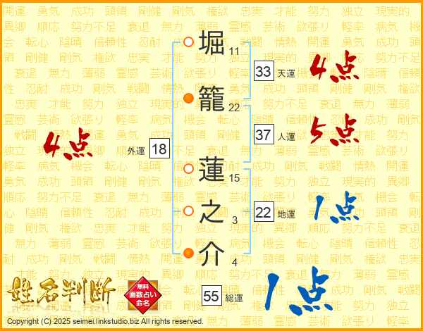 堀(11画)籠(22画) 蓮(15画)之(3画)介(4画)