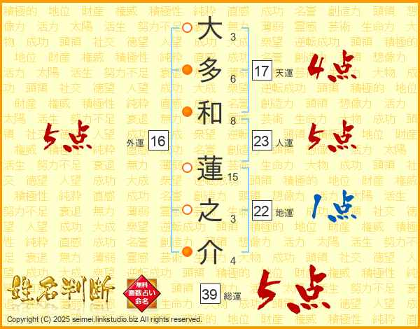 あなたの人生を表す1番重要な運勢です。生涯を通じて影響する総合運となり、主に50歳以降の晩年期に影響を及ぼします。苗字と名前の合計画数。
