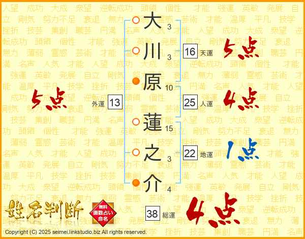 大(3画)川(3画)原(10画) 蓮(15画)之(3画)介(4画)