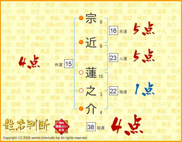 宗(8画)近(8画) 蓮(15画)之(3画)介(4画)
