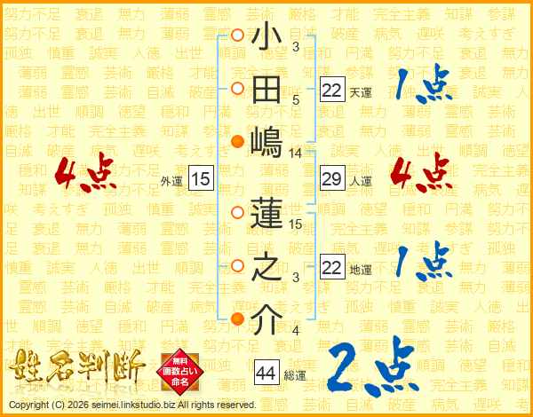 小(3画)田(5画)嶋(14画) 蓮(15画)之(3画)介(4画)