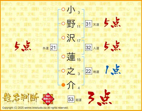 小(3画)野(11画)沢(17画) 蓮(15画)之(3画)介(4画)