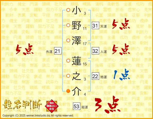 小野澤蓮之介さんの総運は53画の3点!