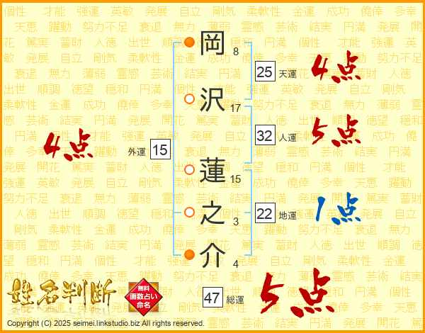 岡(8画)沢(17画) 蓮(15画)之(3画)介(4画)
