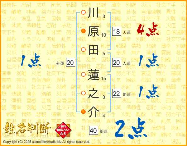 生活面を象徴する運勢です。外部から受ける影響力を表し、結婚運、家庭運や職場、環境への順応性を表します。総運から人運を引いた画数。姓や名が1文字の場合を除く。