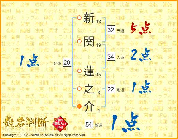 新関蓮之介さんの総運は54画の1点!