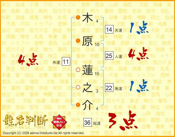 木(4画)原(10画) 蓮(15画)之(3画)介(4画)