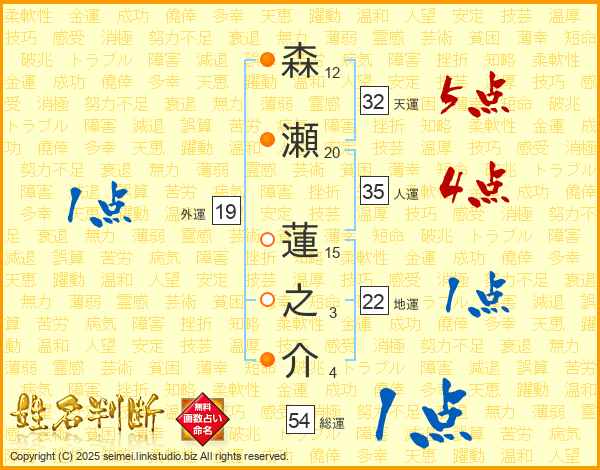 森(12画)瀬(20画) 蓮(15画)之(3画)介(4画)