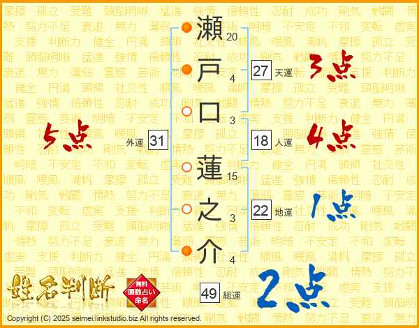 瀬(20画)戸(4画)口(3画) 蓮(15画)之(3画)介(4画)