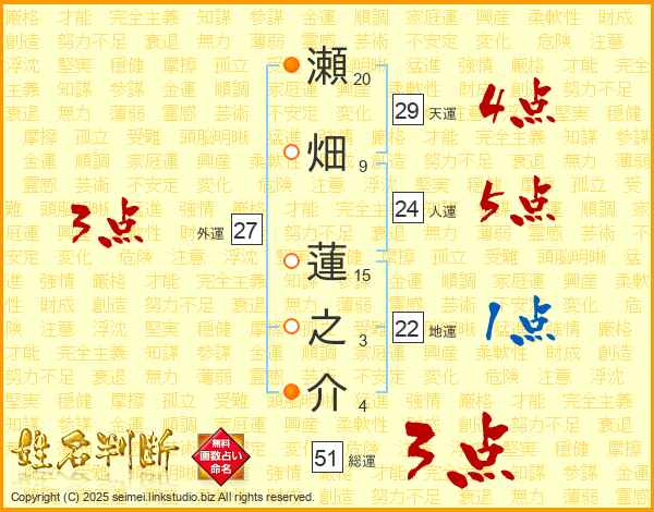 瀬(20画)畑(9画) 蓮(15画)之(3画)介(4画)