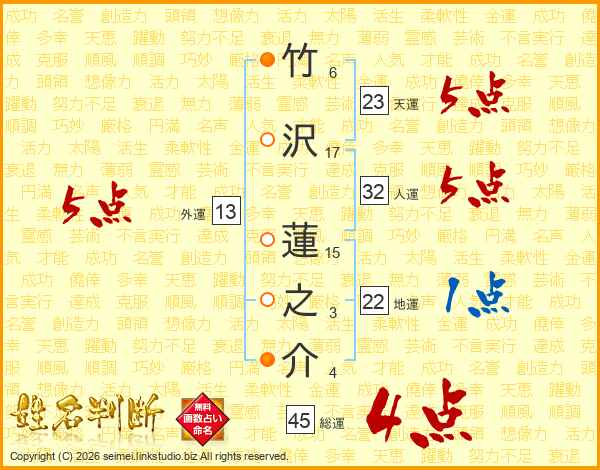 竹(6画)沢(17画) 蓮(15画)之(3画)介(4画)