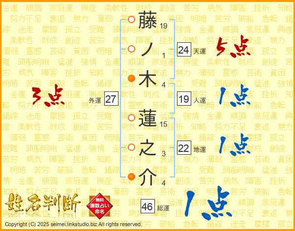 藤(19画)ノ(1画)木(4画) 蓮(15画)之(3画)介(4画)